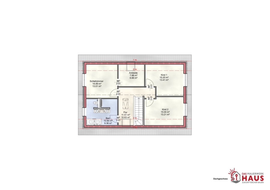 Über eine gewendelte Vollholztreppe erreicht man das 75 m² große Dachgeschoss. Hier bekommt jedes Familienmitglied seinen eigenen Rückzugsort. Zwei Kinderzimmer, ein geräumiges Elternschlafzimmer mit angrenzender Ankleide und ein großes Familienbad bilden das geräumige Dachgeschoss.