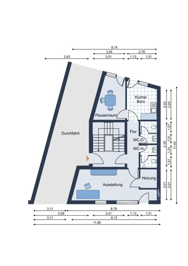 Im vorderen Bereich des Hauses befindet sich im Erdgeschoss ein Büro, das direkt der Halle zugeordnet ist. Über dem Büro befinden sich zwei Wohneinheiten, weshalb ein rücksichtsvoller Mieter gesucht wird, der keinen starken Lärm verursacht und keinen hohen Kunden- oder Lieferverkehr hat.