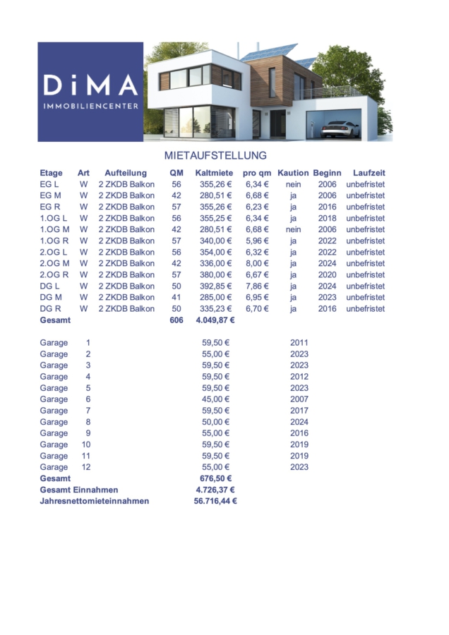 Dieses gepflegte, halb freistehende Mehrfamilienhaus wurde 1964 errichtet und präsentiert sich heute als attraktive Kapitalanlage. Auf einem Grundstück von ca. 805 m² stehen insgesamt 12 Wohneinheiten mit einer Wohnfläche von ca. 605 m² zur Verfügung. Ergänzt wird das Angebot durch einen großzügigen Garten und Hofanlage mit 12 Garagen.