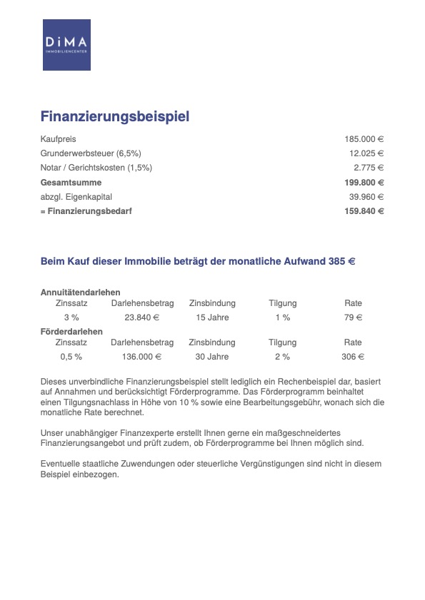 Beim Kauf dieser Immobilie beträgt der monatliche Aufwand unter Berücksichtigung des Förderdarlehens nur 385,47 €.